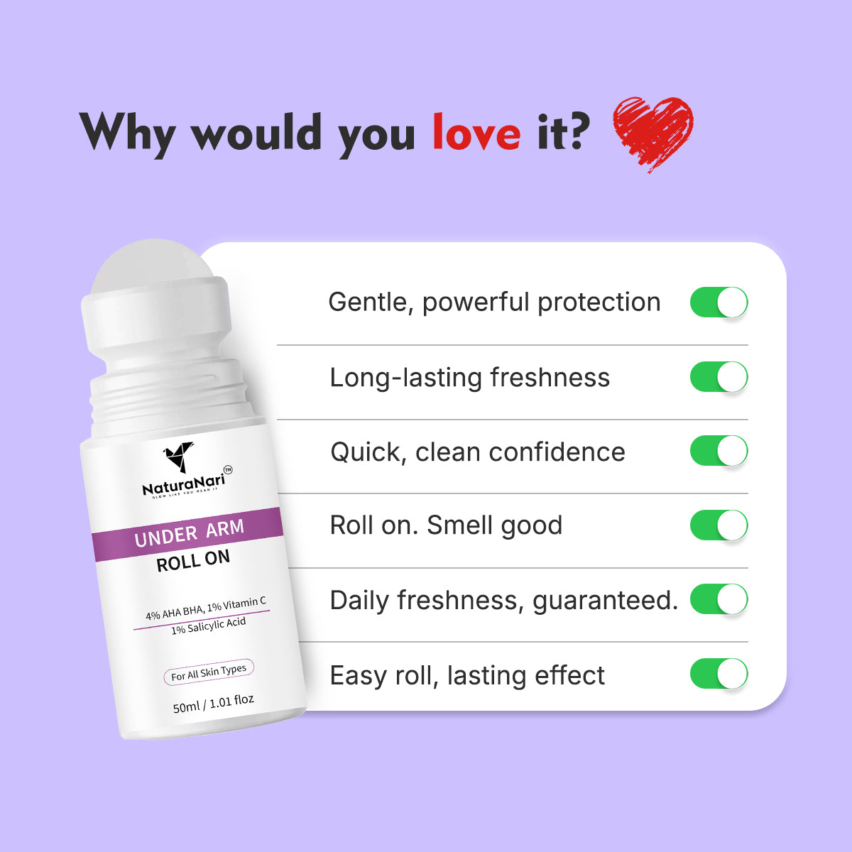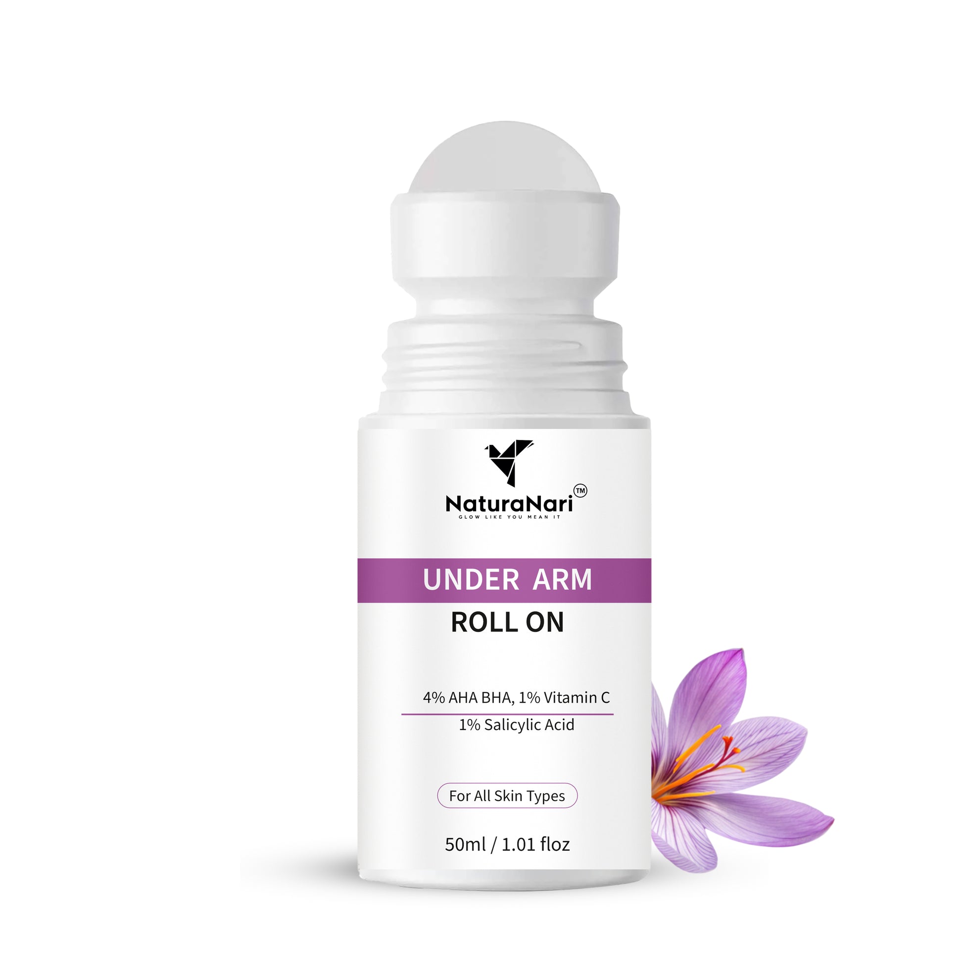 NaturaNari Under Arm Roll On is a premium skincare solution for brighter, smoother, and fresher underarms, suitable for all skin types. Featuring 4% AHA BHA, 1% Vitamin C, and 1% Salicylic Acid, this roll-on gently exfoliates, lightens pigmentation, and fights odour-causing bacteria, making it ideal for daily underarm care.